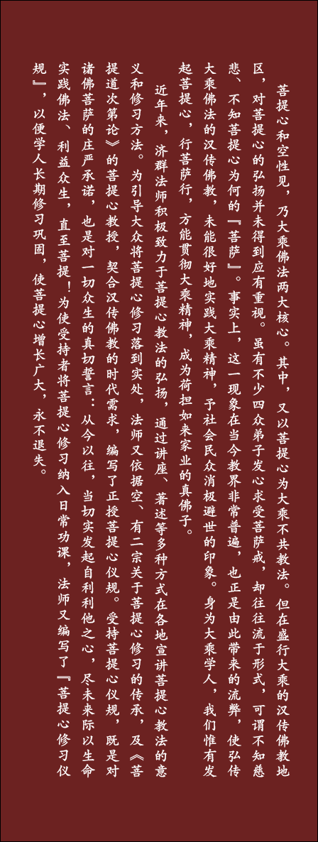 近年来,济群法师积极致力于菩提心教法的弘扬,通过讲座、著述等多种方式在各地宣讲菩提心教法的意义和修习方法,希望广大佛子发菩提心,行菩萨行,成为合格的大乘学人。为使大众将菩提心修习落到实处,法师又依据空、有二宗关于菩提心修习的传承,及《菩提道次第论》的菩提心教授,契合汉传佛教的时代需求,编写了菩提心传授和修习仪轨,以便学人长期修习、巩固,使菩提心增长广大,永不退失。